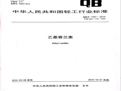 本标准按照GB/T1.1-2009给出的规则起草。本标准使用重新起草法修改采用食品法典委员会(CAC)下属的食品添加剂联合专家委员会(JECFA)制定的乙基香兰素》(代号为JECFA893)本标准是对QB/T1791一2006《乙基香兰素》的修订。本标准与QB/T1791一2006相比,主要技术变化如下:删除了涉及食品添加剂的内容(见2006年版1):含量(GC)由“≥98.0%”改为“不小于99.0%”(见4.5,2006年版4.5):含量的测定由填充柱气相色谱法改为毛细管柱气相色谱法(见5.5,2006年版5.5):本标准与CACJECFA893)相比,主要技术差异如下:色状由“无色或微黄色片状结晶”改为“无色或微黄色结晶或结晶性粉末”(见4.1):点(℃)由“78改为76.0~78.0*(见4.3):含量(GC)由≥98%”改为“不小于99.0%”(见4.5)本标准由中国轻工业联合会提出。本标准由全国香料香精化妆品标准化技术委员会(SAC/TC257)归口。本标准起草单位:嘉兴市中华化工有限责任公司、上海香料研究所。本标准主要起草人:毛海舫、金其璋、邹炳其、杜德样。本标准的历次版本发布情况为:QB/T1791-1993