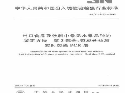 SN/T3729的本部分规定了出口食品和饮料中查成分的实时荧光PCR检测方法本部分适用于果汁、果酱及其他以水果为原辅料的食品中杏成分的定性检测。本部分所规定方法的最低检出限(LOD)为1%(质量分数)。2规范性引用文件