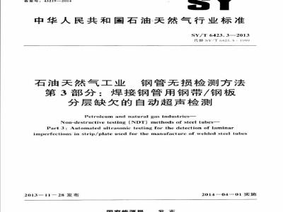SY/T6+23的本部分规定了焊接钢管制造用钢带/钢板在生产钢管之前或生产过程中在制管厂完成的分层缺欠的自动超声检测要求。注1:对于焊接钢管,由制造商选择,可在焊接之后按照SYT6423.+对分层缺欠进行相应的钢管超声检测作为替代方法