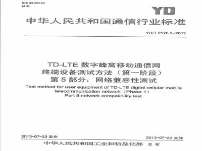a)YD/T2575-2013《TD-LTE数字蜂窝移动通信网终端设备技术要求(第一阶段)》b)YD/T2576-2013《TD-LTE数字蜂宽移动通信网终端设备测试方法(第一阶段)》,它分为5个部分: