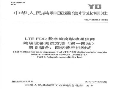 一一第5部分:网络兼容性测试。本部分为YD/T2578-2013《LTEFDD数字蜂窝移动通信网终端设备测试方法(第一阶段)》的第5部分。