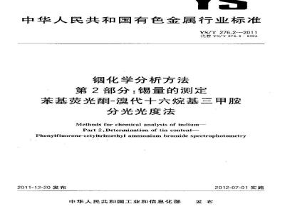 一第10部分:铋、铝、铅、铁、铜、镉、翎、铊量的测定电感耦合等离子体原子发射光谱法;第11部分:砷、钻、铅、铁、铜、锅、锡、、锌、铋量的测定、电感耦合等离了休质谱法。本部分按照GB/T 1.1 给出的规则起靠。本部分为 YS/T 276的第一部分。本部分代替YS/T276.2—1994《铟化学分析方法苯荔酮-溴代十六烷基三甲胺分光光度法测定锡量》,与YS/T276.2-1991相比,主要有如下变动:测定范用0.0010%~0.025%打展至0.00050%~0.500%;—-补充了精密度、质量保证和控制条款;-补充了“试验报告”要求。