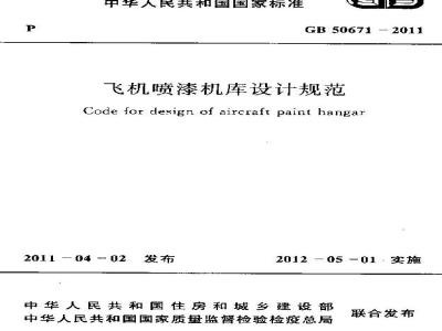 《飞机喷漆机库设计规范》的公告现批准&飞机喷漆机库设计规范”为国家标准,编号为GB50671一2011,自2012年5月1口起实施。其中,第3.0.2,5.1.3、5.1.4、5.1.5.5.2.1.5.2.2、5.2.6、5.3.1.5.3.2、6.3.1、7.3.9、7.5.3、7.5.5、9.1.2条为强制性条文,必须严格执行。