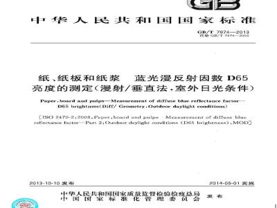 纸、纸板和纸浆蓝光漫反射因数D65亮度的测定(漫射/垂直法,室外日光条件)本标准规定了纸、纸板和纸浆D65亮度的测定方法。GB/T7974—2013