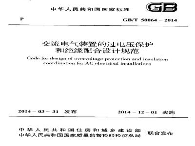现批准《交流电气装置的过电压保护和绝缘配合设计规范》为国家标准,编号为(B/T500642014,自2014年12月1日起实施。原《.L业与民用电力装置的过电压保护设计规范》GBJ61-83同时废止。