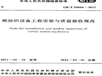 关于发布国家标准《棉纺织设备下程装与质最验收规范》的公告现批雅棉纺织设备程安装与质量验收规范为国家标雅编号为GB/T50664—2011.自2012年3月1H起实施:本规范电我部标注额研究所组织排国计划能版社出版发行