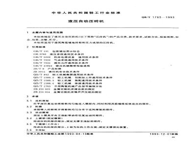 本标准规定了液压自动压砖机(以下简称“压砖机”)的产品分类、技术要求、试验方法、检验规则、标志、包装、运输、贮存。本标准适用于建筑陶瓷墙地砖粉料压力成型的压砖机。 QB/T 1765-1993 液压自动压砖机 QB/T1765-1993 标准下载解压密码:www.bzxz.net
