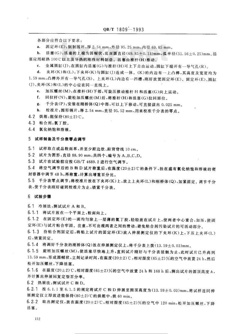 5.1试样取自成品鞋面革,并至少距边欣、距背脊线10cm。5.2试片为圆形,直径88.90mm,共四个,编号为A、B、C、D。5.3试片在试验前应按GB/T4689.2进行空气调节。5.4将空气调节后的B和D试片称重后,在温度(20土2)℃的条件下,挂在盛有氯化钠饱和溶液的密封容器中调节48h,再称重,计算出增重百分比。5.5千分表零点调节:将校准片放在下夹环(K)上,放上上夹环(L)和刚桥体(Q),加紧固定。调节千分表,使千分表刚好碰到校准片为止,锁紧千分表。6试验步骤