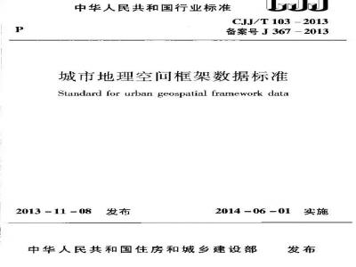住房城乡建设部关于发布行业标准《城市地理空间框架数据标准》的公告现批准《城市地理空间框架数措标准》为行业标准,编号为CIJ/T103·2013,白2014年6月1日起实施,原城市地理空间框架数据标推》CI103-2004同时废止,本标出我部标准定额研究所组织国建筑工业版社出版发行。