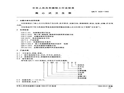 本标准规定了离心式卫生泵的产品分类、技术要求、试验方法、检验规则、标志、包装、运输、贮存等内容。本标准适用于乳与乳制品等食品流体物料箱送的离心式卫生泵(以下简称“卫生泵”)。 QB/T 1826-1993 离心式卫生泵 QB/T1826-1993 标准下载解压密码:www.bzxz.net