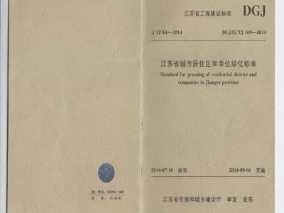 省住房和城乡建设厅关丁发布江苏省工程建设标准《江苏省城市居住区和单位绿化标准》的公告现批准《江苏省城市居住区和单位绿化标准》为江苏省工程建设标准,编号为DGJ32/TJ169-2014,自2014年9月1日起实施。原《江苏省城市居住区和单位绿化标准》DB32713995同时废止。