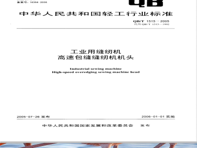 本标准是对QB/T1515一1992《工业用缝纫机GN型高速包缝机机头》的修订。本标准与QB/T1515一1992相比,主要变化有:将原标准名称改为“工业用缝纫机高速包缝缝纫机机头”;-对原标准的第2章“引用标准”作了修改:对原标准的第3章“术语与定义”作了修改或删除对原标准的“基本参数”作了修改;在“机器性能”中增加了4项要求;对“运转性能”中的噪声声压级根据不同的转速作了修改,当最高缝速不大于5500针/分时,噪声声压级应不大于80dB(A):当最高缝速大于5500针/分直不大于6500针/分时,噪声声压级应不大于82dB(A);当最高缝速大于6500针/分时,噪声声压级应不大了85dB(A);对“试验方法”的内容作了修改和增加;在“标志”中增加了产品标准编号标志内容:检验规则按GB/T2828.1-2003、GB/T2829-2002的规定进行编写。本标准由中国轻业联合会提出。本标准由全国缝纫机标准化中心I。本标准起草单位:浙汀新杰克缝纫机有限公司、天津天工缝纫机公司、西安标准1业股份有限公司、上海市缝纫机研究所、国家缝纫机质量监督检验中心。本标准主要起草人:邱卫明、褚守善、张敏、王伟刚、张健。本标准自实施之口起,代替原轻1业部发布的轻工行业标准QB/T1515-1992《1业用缝纫机GN型高速包缝机机头》。
