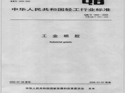 本标准是对QB/T1995-1994《工业明胶》的修订。本标准与QB/T1995-1994相比主要修改如下:调整了工业明胶的分类方法及部分技术指标:测试时不再考虑试样本身的含水量;QB/T1995-2005