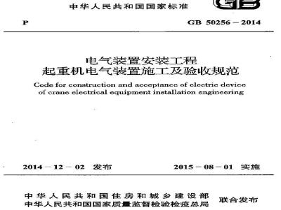 现批准电气装置安装工程起重机电气装施工及验收韧范》为国家标,编号为GB50256一2014,自2015年8月1日起实施。其中,第3.0.9【2)4.0.1(3)、6.0.4(1)、6.0.9条(款)为强制性条文,必频严格执行。原国家标推电气装留安装工程起重机电气装施工及验收规范GB50256一96同时废止。