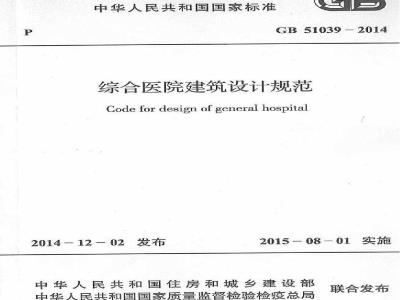 《综合医院建筑设计规范》的公告现批准《综合医院建筑设计规范》为国家标准,编号为GB51039一2014,自2015年8月1日起实施。其中,第6.2.57.2.4、8.1.3、8.3.5、8.6.7、10.2.8(2、3)条(款)为强制性条文,必须严格执行。原行业标准《综合医院建筑设计规范》JGJ49-88同时废止。