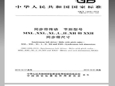 本标准代替GB/T116161989《同步带尺寸》,与GB/T11616—1989相比,主要技术变化如下:增加了节线差的图示和具体数值(见图1和表1):增加了双面齿带的带长和带宽要求(见3.3和表6);删除了XXL型带长度代号(见1989年版的表6)。节距型号MXLXXL,XL,LH,