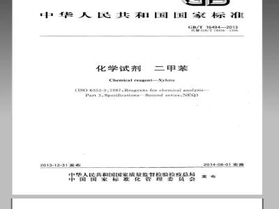 “二甲苯\编制,与ISO6353-3:1987的一致性程度为非等效本标准由中国石油和化学工业联合会提出。本标准由全国化学标准化技术委员会化学试剂分会(SAC/TC63/SC3)归口。本标准负责起草单位江苏强盛功能化学股份有限公司。本标准主要起草人:妇向红。