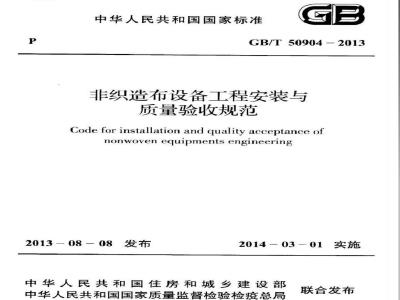住房城乡建设部关于发布国家标准《非织造布设备工程安装与质量验收规范》的公告现批准《非织造布设备工程安装与质量验收规范》为国家标准,编号为GB/T50904--2013,自2014年3月1日起实施。本规范由我部标准定额研究所组织中国计划出版社出版发行。
