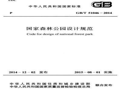 住房城乡建设部关于发布国家标准《国家森林公园设计规范》的公告现批准《国家森林公园设计规范》为国家标准,编号为GB/T51046-2014,自2015年8月1日起实施。本规范由我部标准定额研究所组织中国计划出版社出版发行。