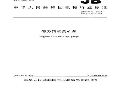 本标准按照GB/1.12009给出的姚则起革。本标准代替JB/7742—1995《小型磁力传动离心泵》,与JBT7742--1995扣比1要技术变化如下:修改了标推名称(1995件版):一:增加了前音部分(见前前):修收了的1作性能范图,删除了2种型号,增加了6种规盛的塞,并扩人了转速范将(别4.3.1,1995年版的3.3.2表1: