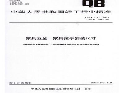 增加了表面和嵌入组合安装式家具拉手的安装方式及示意图(见4.1,图3);增加了封边拉手的安装方式及示意图(见4.1,图4);增加了分图“螺钉安装孔的结构”(见图5):增加了螺钉旋合长度要求和平面接触直径要求(见表1):修改了安装尺寸的公差要求(见表1,表2);增加了表面和嵌入组合安装式家具拉手的安装尺寸要求(见5.3):增加了封边拉手的安装尺寸要求(见5.4):修改了附录A中的图A.1、图A.2和图A.3(见附录A)。本标准由中国轻工联合会提出。本标准由全国家具标准化中心归口。本标准主要起草单位:杭州千年舟家具有限公司、成都市产品质量监督检验院、浙江省家具与五金研究所、上海市质量监督检验技术研究院。本标准参加起草单位:深圳市鸿景源五金塑胶制品有限公司。本标准主要起草人:李隆平、陆铜华、张晓杰、李丽、张永球、钟文翰、应新法、毕海明、钟超。本标准所代替标准的历次版本发布情况为:QB/T1241-1991。