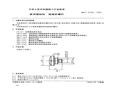 本标准规定了家用缝纫机挑线杆螺钉的产品分类、技术要求、试验方法、检验规则及标志、包装、运输、贮存。本标准适用于JA型家用缝纫机的挑线杆螺钉。 QB/T 2146-1995 家用缝纫机挑线杆螺钉 QB/T2146-1995 标准下载解压密码:www.bzxz.net