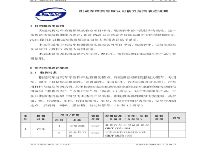 机动车检测领域认可能力范围表述说明为提高机动车检测领域实验室项目申请、现场评审的一致性和有效性,进一步规范该领域检测能力表述,促进CNAS认可结果更好地为相关方所理解和接受,CNAS秘书处对机动车检测领域认可能力范围表述给予说明。本文件适用于机动车检测领域实验室认可项目申请、现场评审,以及实验室认可证书(附件)的能力范围表述。本表述说明及其附录以汽车示例,摩托车、拖拉机和农用运输车等产品可参照使用。