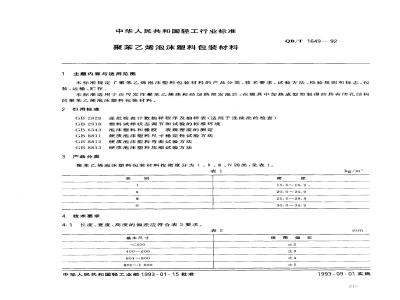 本标准规定了聚苯乙烯泡沫塑料包装材料的产品分类、技术要求、试验方法、检验规则和标志、包装、运输、贮存。本标准适用于由可发性聚苯乙烯珠粒经加热预发泡后,在模具中加热成型而制得的具有闭孔结构的聚苯乙烯泡沫塑料包装材料。 QB/T 1649-1992 聚苯乙烯泡沫塑料包装材料 QB/T1649-1992 标准下载解压密码:www.bzxz.net