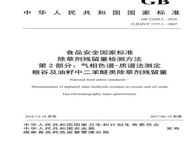 GB 23200.2-2016 食品安全国家标准 除草剂残留量检验方法 第2部分:气相色谱-质谱法测定 粮谷及油籽中二苯醚类除草剂残留量