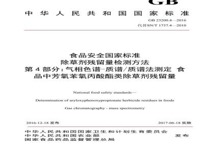 GB 23200.4-2016 食品安全国家标准 除草剂残留量检测方法 第4部分:气相色谱-质谱 质谱法测定 食品中芳氧苯氧丙酸酯类除草剂残留量