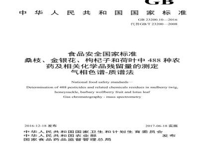 National food safety standards-Determination of 488 pesticides and related chemicals residues in mulberry twig,honeysuckle,barbarywolfberryfruitandlotusleafGas chromatography - mass spectrometry2016-12-18发布
