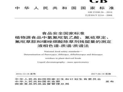GB 23200.36-2016 食品安全国家标准 植物源性食品中氯氟吡氧乙酸、氟硫草定、氟吡草腙和噻唑烟酸除草剂残留量的测定 液相色谱-质谱 质谱法