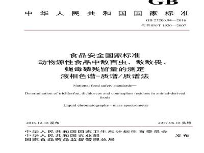 GB 23200.94-2016 食品安全国家标准 动物源性食品中敌百虫、敌敌畏、蝇毒磷残留量的测定 液相色谱-质谱 质谱法