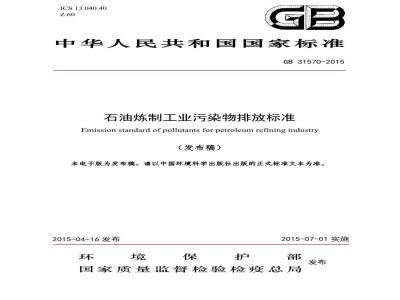 新建企业自2015年7月1日起,现有企业自2017年7月1日起,其水污染物和大气污染物排放控制按本标准的规定执行,不再执行《污水综合排放标准》(GB8978-1996)、《大气污染物综合排放标准》(GB16297-1996)和《工业炉窑大气污染物排放标准》(GB9078-1996)中的相关规定。各地也可根据当地环境保护的需要和经济与技术条件,由省级人民政府批准提前实施本标准。本标准是石油炼制工业水污染物和大气污染物排放控制的基本要求。地方省级人民政府对本标准未作规定的项目,可以制定地方污染物排放标准;对本标准已作规定的项目,可以制定严于本标准的地方污染物排放标准。环境影响评价文件或排污许可证要求严于本标准或地方标准时,按照批复的环境影响评价文件或排污许可证执行。本标准由环境保护部科技标准司组织制订。本标准起草单位:抚顺石油化工研究院、中国环境科学研究院。本标准环境保护部2015年4月3日批准。本标准自2015年7月1日起实施。本标准由环境保护部解释。