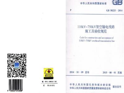 现批准110kV~750kV架空电线路施工及验收规范》为国家标准,编号为GB50233-2014,自2015年8月1日起实旗。其中,第 6. 1.2、7. 2. 1,8. 4. 1,8.4.7 条为强制性条文,必须严格执行。原国家标准110~500kV架空送电线路施工及验收规范》GB50233--2005.750kV架空送电线路施工及验收规范》GB50389—2006同时度止。