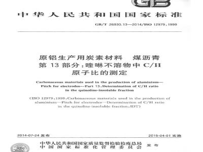 GB/T26930.13—2014/IS012979:1999GB/T26930《原铝生产用炭素材料煤沥青》分为13个部分:第1部分:水分含量的测定共沸蒸馅法;一第2部分:软化点的测定环球法;第3部分:密度的测定比重瓶法:第4部分:唑啉不溶物含量的测定;第5部分:甲苯不溶物含量的测定;第6部分,灰分的测定;