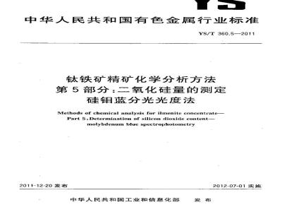 YS/T360《钛铁矿精矿化学分析方法》分为六个部分:第1部分:一氧化钛量的测定硫酸铁铵滴定法;-第2部分:全铁量的测定重铬酸钾滴定法;-第3部分:鼠化亚铁量的测定重铬酸钾滴定法;第4部分:氧化铝量的测定EDTA滴定法;一第5部分:二氧化硅量的测定硅销蓝分光光度法;一第6部分:氧化钙、氧化镁、磷量的测定等离子体发射光谱法。本部分为YS/T360的第5部分,bzxZ.net