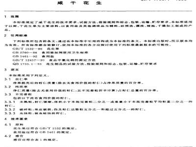 本标准规定了咸干花生的技术要求、试验方法、检验规则和标志,包装、运输、贮存要求。本标准适用于以鲜、干花生果为主要原料,以食用盐及其他调味品为辅料,经预选、漂洗、浸泡、干燥加工制成的产品。