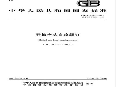 -增加通用技术条件按GB/T16938(见第2章、表2);对钢螺钉,增加不经处理及非电解锌片涂层技术要求按GB/T5267.2(见表2);增加不锈钢螺钉产品及技术要求(见表2):增加“如需其他技术要求或表面处理,应由供需协议”(见表2)。本标准使用重新起草法修改采用ISO1481:2011《开槽盘头自攻螺钉。与ISO1481:2011的技术性差异及其原因如下:在规范性引用文件中,用我国标准代替国际标准(见第2章),增加引用GB/T90.2(见表2)和GB/T1237(见5.1),以符合我国紧固件基础标准。增加包装技术要求(见表2),以符合我国紧固件基础标准。修改标记示例为简化标记示例(见5.2),以符合GB/T1237的规定。本标准由中国机械工业联合会提出。本标准由全国紧固件标准化技术委员会(SAC/TC85)归口。本标准负责起草单位:中机生产力促进中心。本标准参加起草单位:机械工业通用零部件产品质量监督检测中心。本标准由全国紧固件标准化技术委员会负责解释。本标准所代替标准的历次版本发布情况为:GB/T5282—1976,GB/T5282—1985I