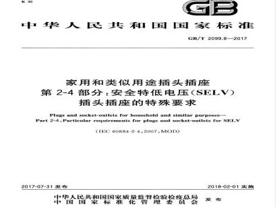 GB∕T 2099.8-2017 家用和类似用途插头插座 第2-4部分:安全特低电压(SELV)插头插座的特殊要求