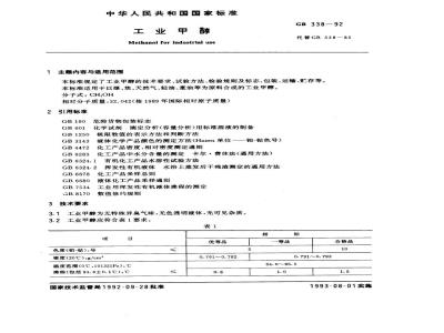 本标准规定了工业甲醇的技术要求、试验方法、检验规则及标志、包装、运输、贮存等。本标准适用于以煤、焦、天然气、轻油、重油等为原料合成的工业甲醇。分子式:CH,OH