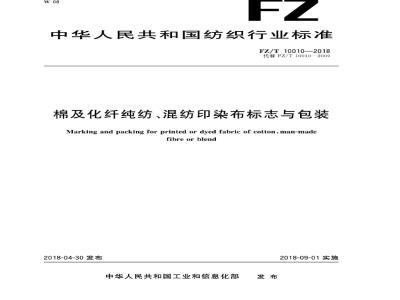 棉及化纤纯纺、混纺印染布标志与包装本标准规定了棉及化纤纯纺、混纺印染布标志与包装。FZ/T10010—2018