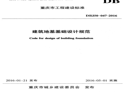 关于发布《建筑地基基础设计规范》的通知各区县(自治县)城乡建委,两江新区、北部新区、经开区、高新区、万盛经开区、双桥经开区建设管理局,有关单位:现批准《建筑地基基础设计规范》(修订)为我市工程建设强制性标准,编号为:DBJ50-047-2016,自2016年5月1日起施行。其中,第5.1.2、6.1.2条为强制性条文。通过住房和城乡建设部审查与备案,备案号为J13150-2016,必须严格执行。原《建筑地基基础设计规范》DBJ50-047-2006同时废止。本规范由重庆市城乡建设委员会负责管理和强制性条文的解释,中冶赛迪工程技术股份有限公司负责具体技术内容解释。重庆市城乡建设委员会