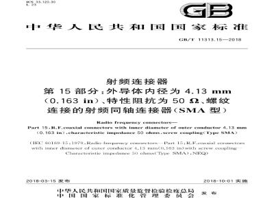 Part 15:R.F.coaxial connectors with inner diameter of outer conductor 4.13 mm(0.163 in),characteristic impedance 50 ohms,screw coupling(Type SMA)(IEC 60169-15:1979,Radio-frequency connectors—Part 15:R.F.coaxial connectorswith inner diameter of outer conductor 4.13 mm(0.163 in)with screw couplingCharacteristic impedance50ohms(TypeSMA),NEQ)2018-03-15发布