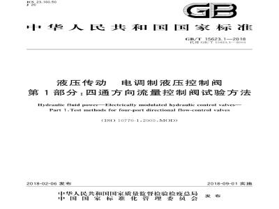 第1部分:四通方向流量控制阀试验方法GB/T15623的本部分规定了电调制液压四通方向流量控制阀性能特性的试验方法。本部分适用于电调制液压四通方向流量控制阀。注:在液压系统中,电调制液压四通方向流量控制阀一般包括伺服阀和比例阀等不同类型产品,能通过电信号连续控制流量和方向变化。以下如没有特别限定,“阀”即指电调制液压四通方向流量控制阀2规范性引用文件