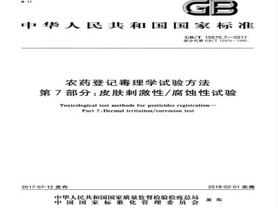 第7部分:皮肤刺激性/腐蚀性试验Toxicological test methods for pesticides registration-Part 7:Dermal irritation/corrosion test2017-07-12发布