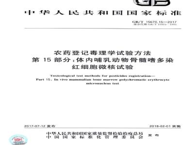 第28部分:慢性毒性与致癌合并试验:第29部分:代谢和毒物动力学试验。本部分为GB/T15670的第15部分。本部分按照GB/T1.1—2009给出的规则起草。本部分部分代替GB/T156701995《农药登记毒理学试验方法》。本部分与GB/T15670—1995的小鼠骨髓多染红细胞微核试验部分相比主要变化如下:修改和调整了标准的总体结构和编排格式:增加了一些章节内容(见第1章、第2章、第3章、第4章、第5章、7.1和第8章);修改了对实验动物的要求(见6.2,1995年版的14.4.1);修改了剂量和分组的内容(见6.3,1995年版的14.4.3);I