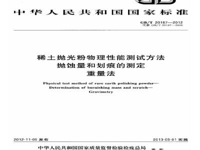 本标推规定了用双面研磨机测定稀士撼光粉的掀蚀量和划痕的方法,GB/T20167—2012
