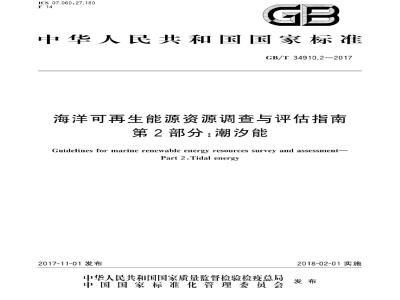 GB/T34910的本部分规定了潮汐能资源调查,数值分析,潮汐能资源评估及潮汐能资源调查与评估报告的编写。