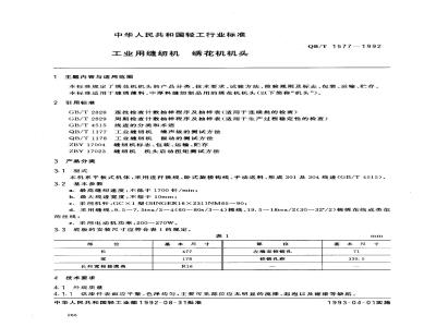 本标准规定了绣花机机头的产品分类、技术要求、试验方法、检验规则及标志、包装、运输、贮存。本标准适用于缝绣薄料、中厚料缝纫制品用的绣花机机头(以下简称“机头”)。 QB/T 1577-1992 工业用缝纫机绣花机机头 QB/T1577-1992 标准下载解压密码:www.bzxz.net